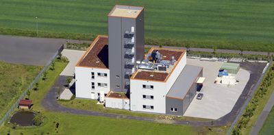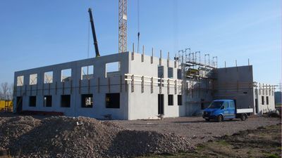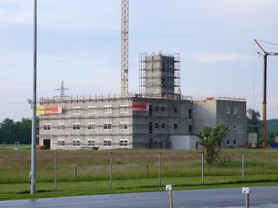 As time progresses we can see more and more of the building growing - the first floor will be completed this week. On the picture the central lift for the test tower (32m for solar silicon processing) can be seen.