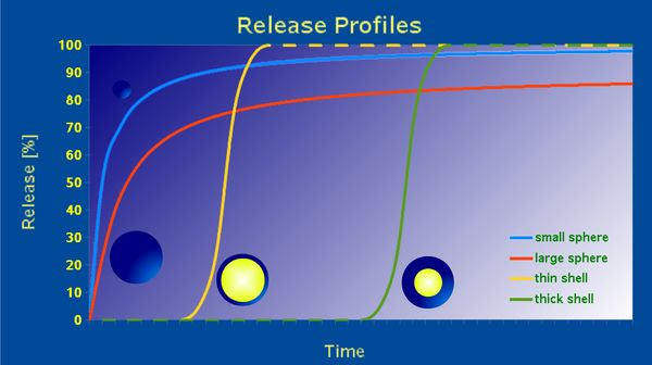These Microspheres are able to release the encapsulated active agents over a defined time. Controlled release Microspheres are optimized by a suitable choice of the shell material and the chosen particle size. The choice of shell materials suitable for the application can be waxes, hydrocolloids or other organic or inorganic materials. Wax embedded active agents with defined controlled release curves and an enhanced stability of the embedded chemicals are produced for cosmetic or pharmaceutical applications.
