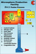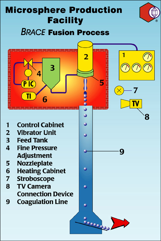 Based on a sphere diameter of 1 mm lab installations have a plastic throughput of about 20 kg/h, pilot plants about 100 to 200 kg/h, and production units can be installed up to 2 t/h. Microsphere production units have a minimal space requirement (15 to 40 sq. Feet), the energy consumption is very low and they are noiseless during operation. These units operate at atmospheric pressure or slightly above and can be designed to be explosion proof according to the GLP/GMP guide lines. Microsphere production units need practically no maintenance, therefore only a minimal staff is required. Units with fully automated controls and remote monitoring can be delivered as an option.